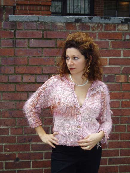 Dolman sleeved pink cardigan. Hand-dyed and knotted yarn and ribbon.