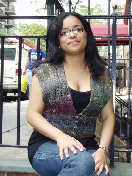Zigzag lace knit cinched waisted button front vest. Metallic/wool variegated dyed multi-colored yarn.